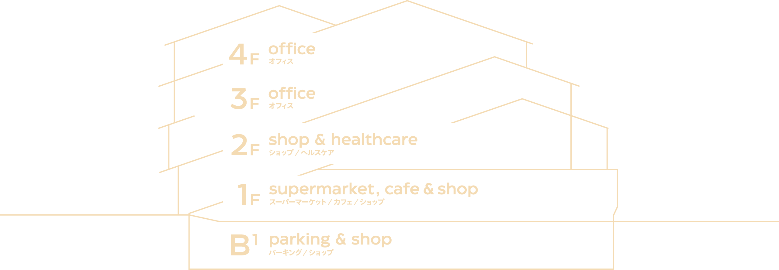 本施設の地上4階、地下1階の各フロアには、「ウェルビーイング」というキーワードのもとに、人々の「毎日の心と体」を支えるサービスが集結します。それは、地域の方々の生活の利便性と質を向上させる食料店舗や飲食店、日常医療から健康・美容の促進までを支えるクリニックやサービス、そして、ここから日本全国、そして世界へとビジネスの輪を広げていく方々に向けたクリエイティブな交流が生まれるオフィスなど、住むことと働くことの新たな関係を示したライフスタイルが展開されます。また、地下には50台以上の駐車場を備え、ここを訪れる方々のお車はもちろん、ここ岡崎エリアを周遊される方々の拠点としても、新たなランドマークとなります。