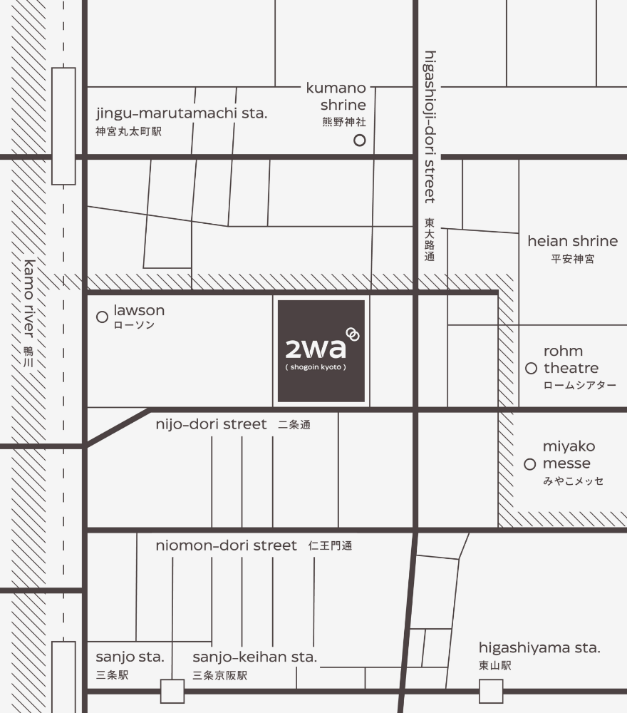 Situated between the commercial area of Kawaramachi and the cultural district of Okazaki, we hope this place becomes a point of intersection where various people meet. We earnestly wish that not only tourists but also local residents use 2wa as a perch, leading to a richer life. As time passes, we pray that 2wa grows within Kyoto, mutually influencing the surrounding community and becoming a building cherished by many.